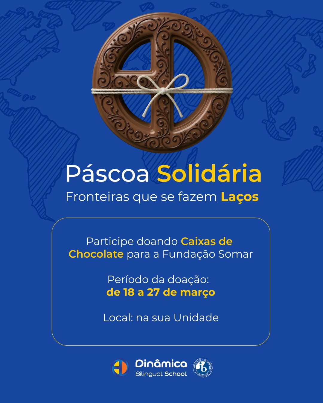 A participação é simples e faz toda a diferença: serão arrecadadas caixas de chocolate, que podem ser entregues na Supervisão Escolar de cada unidade, no período de 18 a 27 de março. A entrega das doações na Fundação Somar acontecerá em data a ser confirmada e, em breve, compartilharemos mais detalhes sobre esse momento especial, que contará com representantes das nossas unidades, simbolizando o abraço de toda a comunidade Dinâmica.